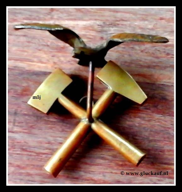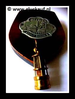 Koperen embleemhamers van mijnwerkers met haak, hier kan je een kmijnwerkerslamp aan hangen, deze was voor 25 jaar bestaan Staatsmijn Wilhelmina.