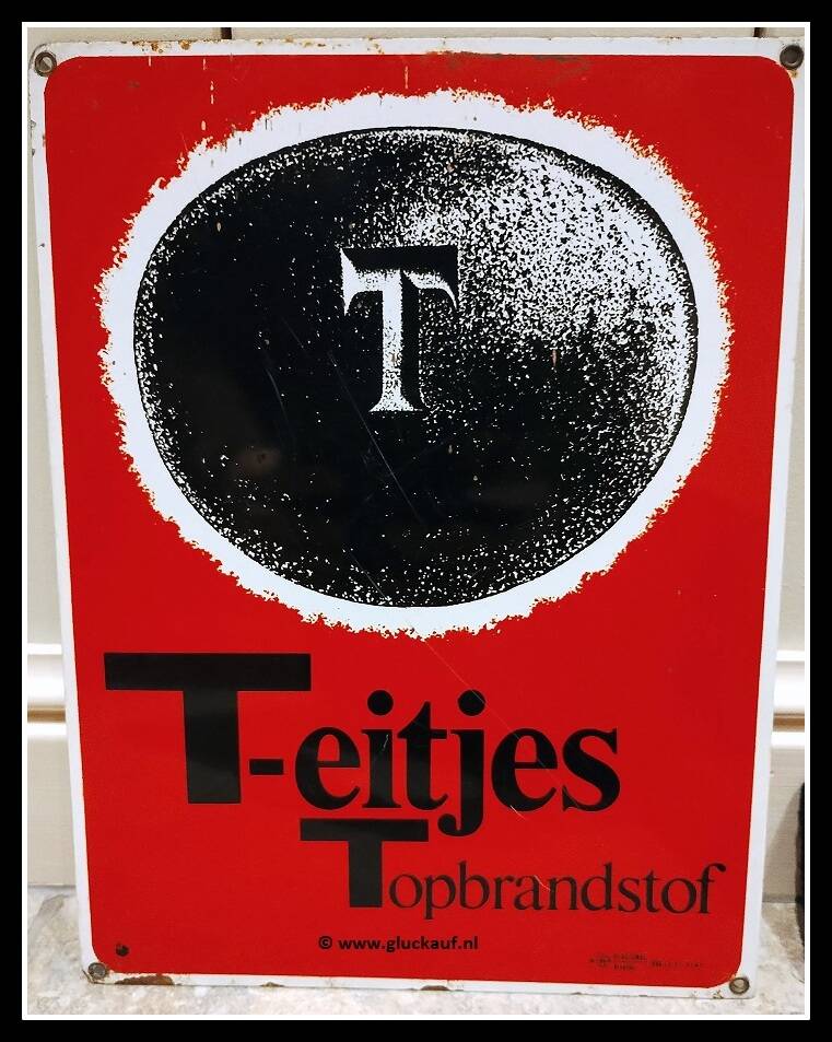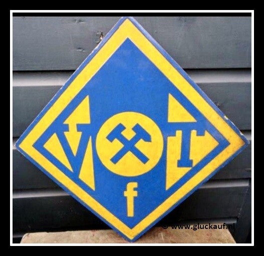Een ruitvormig bord met afkorting V f T ( waarschijnlijk voor: Vereniging voor Techniek voor staat ), waarin symbolen voor vakmanschap, energie en vooruitgang zijn verwerkt. Het bord heeft waarschijnlijk als herkenningsteken, reclame voor een technische organisatie wat betrekking had op de Mijnbouw.