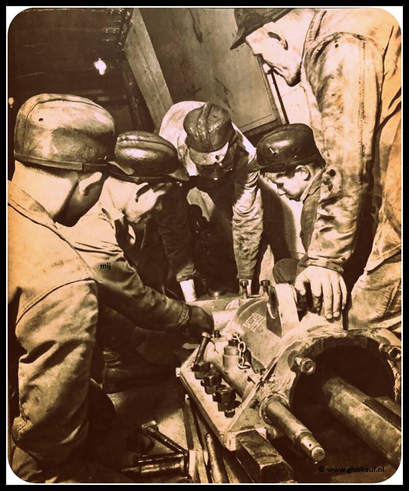 Voormalige schuilkelder van de Stm. Hendrik. Wordt les gegeven door baas Hoeflaken, aan OVS-ers. Werken aan een schudgootmotor. De foto is uit 1949. © Driessen / www.gluckauf.nl