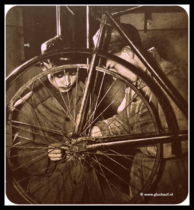 In de O. V. S. Werkplaats op Stm. Hendrik repareren T. Wijkman ( L ) en S. Daemen een fiets. De foto is uit 1949.© Cals/ www.gluckauf.nl