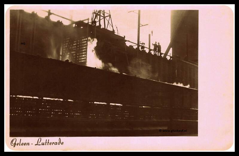 Ansichtkaart. Lutterade Mijn Cokesbatterij Uitstorten der gloeiende cokes 1949.© H. Leufkens / www.gluckauf.nl