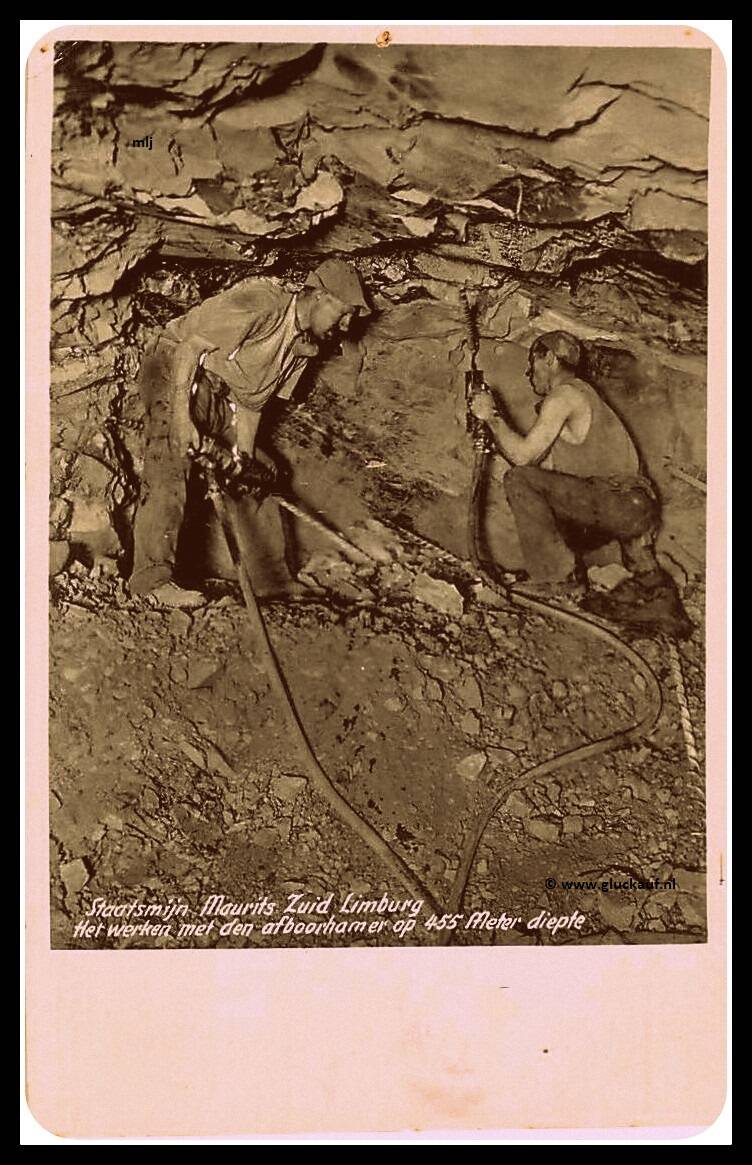 Ansichtkaart. Staatsmijn Maurits Het werken met af boorhamer op 455 meter diepte.© Gebr. Simons Ubach-over-Worms / www.gluckauf.nl