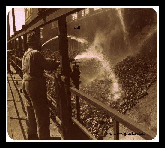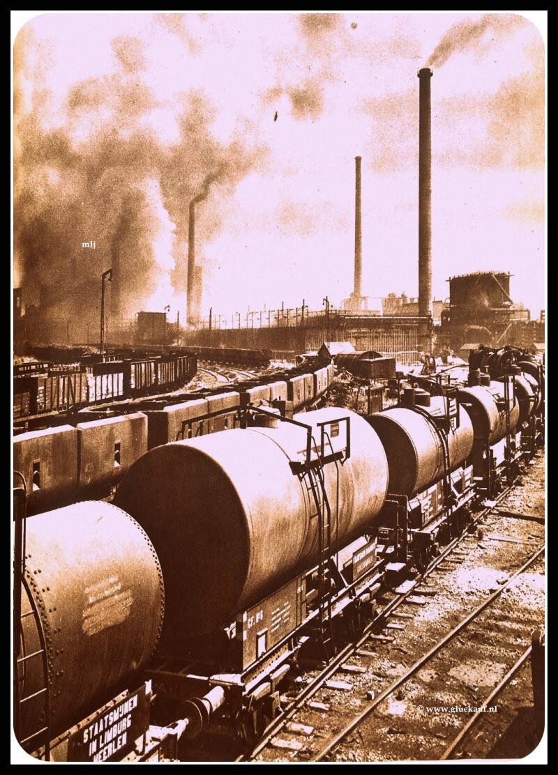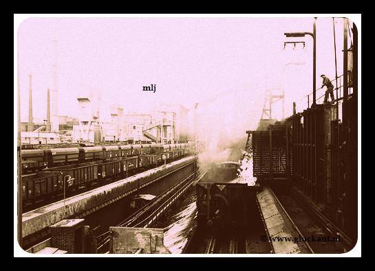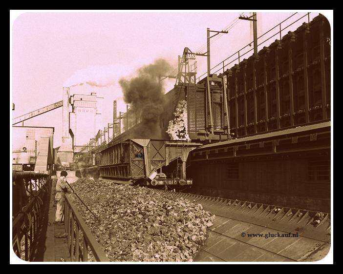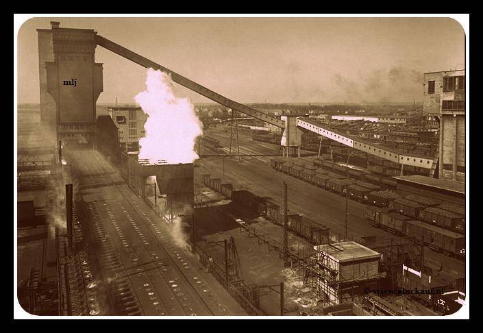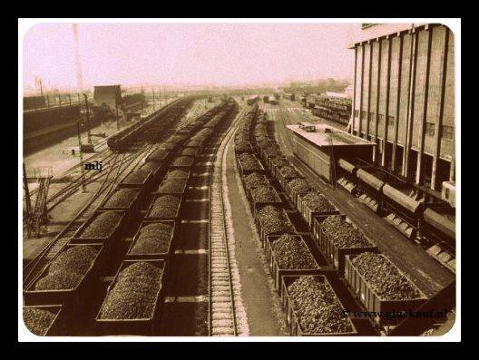 cokes-treinengoederentreinen met kolen op het rangeerterrein van de Cokesfabrieken Maurits. 10 april 1947. © Stm./www.gluckauf.nl