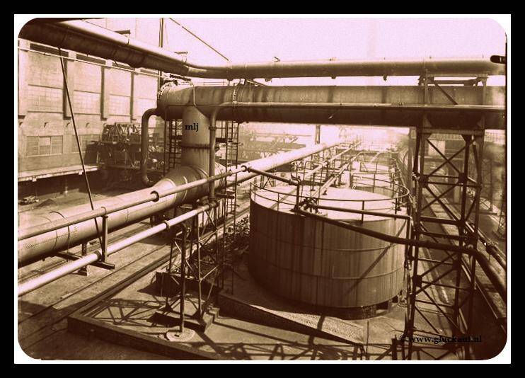 Cokesoven van de Cokesfabriek Maurits uit 1946. Het gas dat door de leidingen wordt afgevoerd wordt in de chemische bedrijven omgezet in reeks waardevolle stoffen. © Stm./www.gluckauf.nl