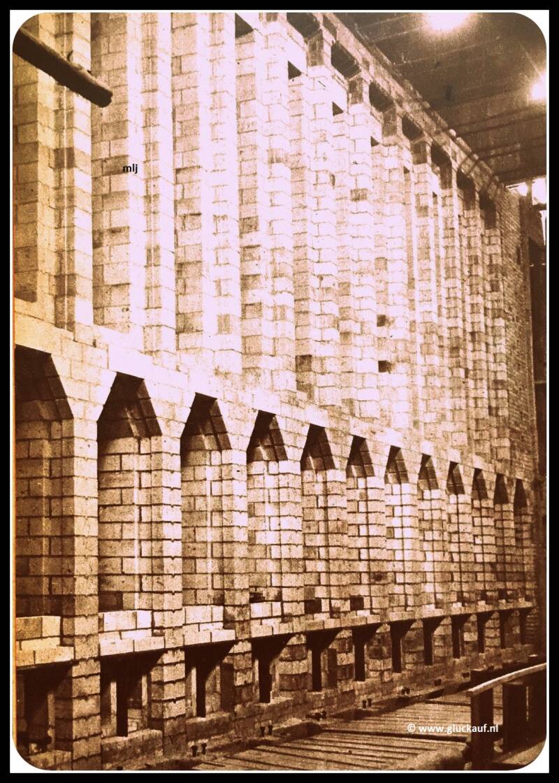 Een blok van 25 ovens. De bovenste openingen zijn de overkamers in het midden de regeneratoren, daaronder de rookgaskanalen. Cokesfabriek Maurits uit 1948. © Stm./ www.gluckauf.nl