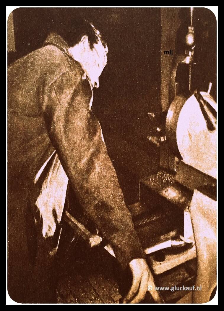 Leerling van de B.V.S 1948 Jan Smeets aan de schaafbank . Cokesfabriek Maurits.