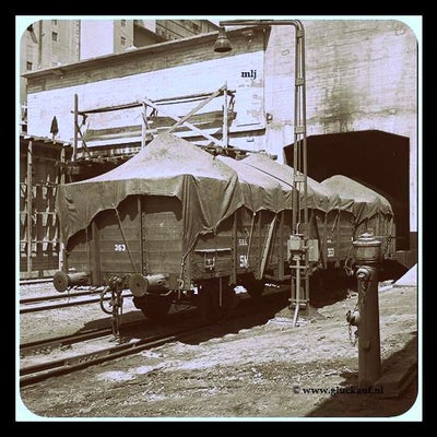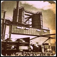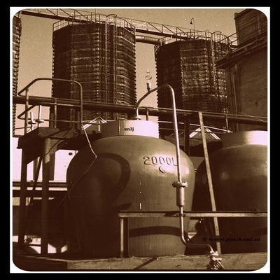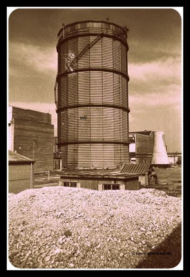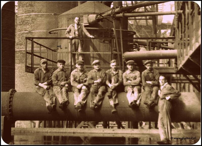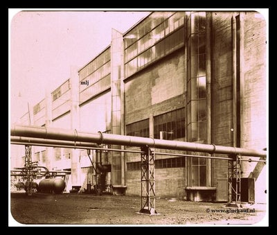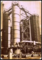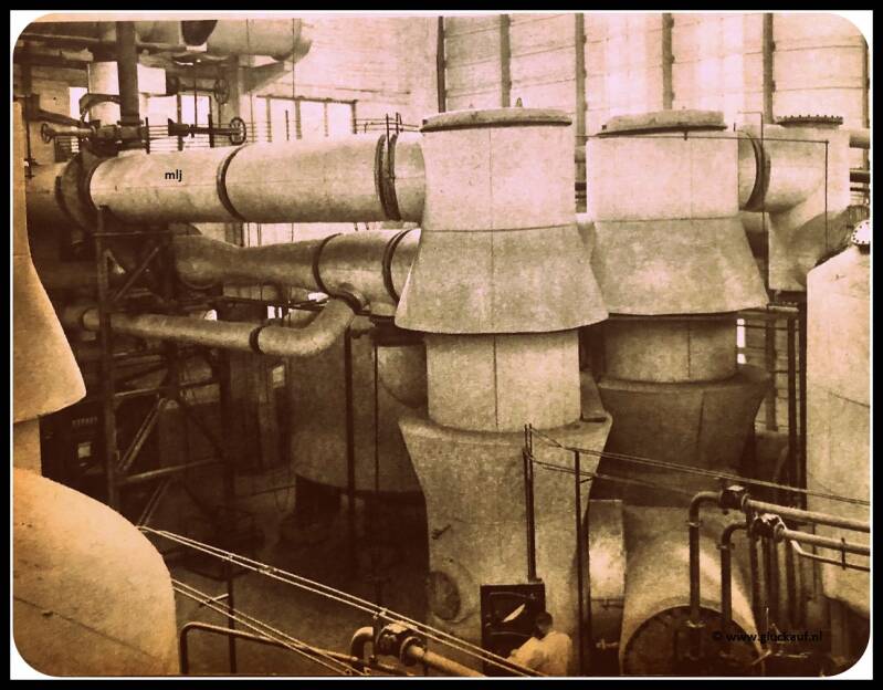 Een deel van het conversiegebouw de Synthesegasfabriek. Convertoren en leidingen zijn bekleed met een dikke laag isolatie materiaal. In verband met de hoge temperaturen die bij de omzetting van het gasmengsel optreden. De foto is uit 1949.