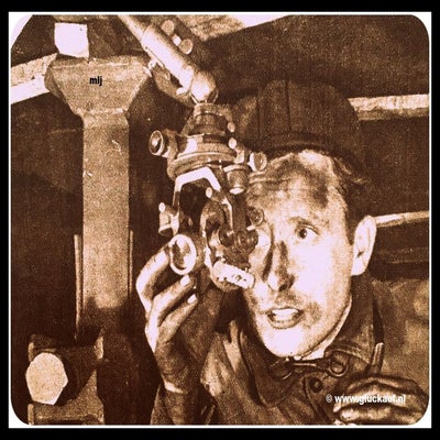 Hoofd opzichter J.H.M. Beugels bij de opmetingen . Om de 14 dagen wordt de stand van de pijler door de mijnmeter opgenomen , waarbij hij de ophangtheodoliet gebruikt. Dit meetinstrument ,dat aan de kap of stijl wordt bevestigd , neemt weinig plaats in.© C